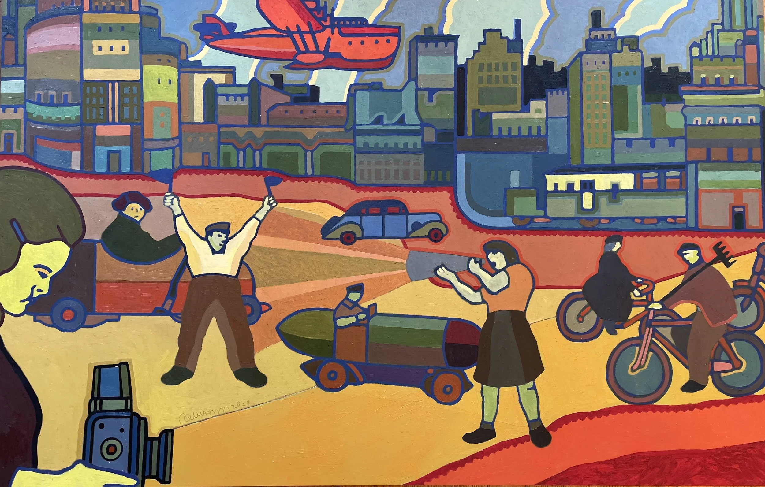 In his latest exhibition Siguiendo la ruta (Following the route), Dairan Fernandez de la Fuente explores themes of memory, family history and immigration. Art Deco motifs abound in the artist’s latests colorful paintings, woodcut prints, and drawings on view at Galería Cubana. Fernandez has long been inspired by the 1930s, a time when his his family immigrated to Cuba. Planes, trains and automobiles are symbolic themes in his vibrant work. The artist finds beauty in the machines of that time, and reflects on how these modes of transportation are used by those in search of better opportunities.
