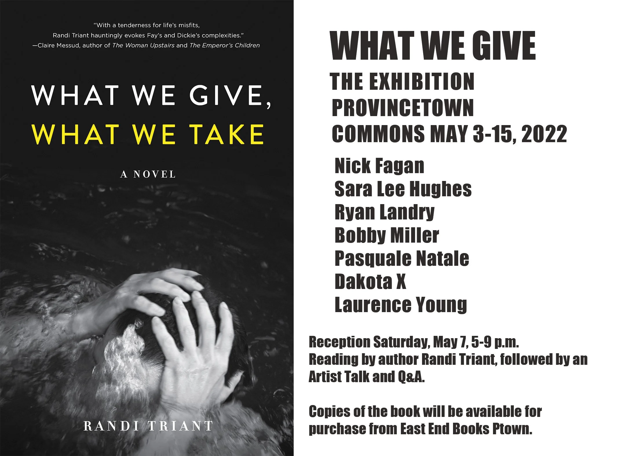 The exhibition opening will include a brief reading from a new novel by Provincetown resident, Randi Triant. What We Give, What We Take is the coming-of-age story about a disabled man living in Provincetown with a man dying of AIDS. The reading will be followed by an artist talk and Q and A.